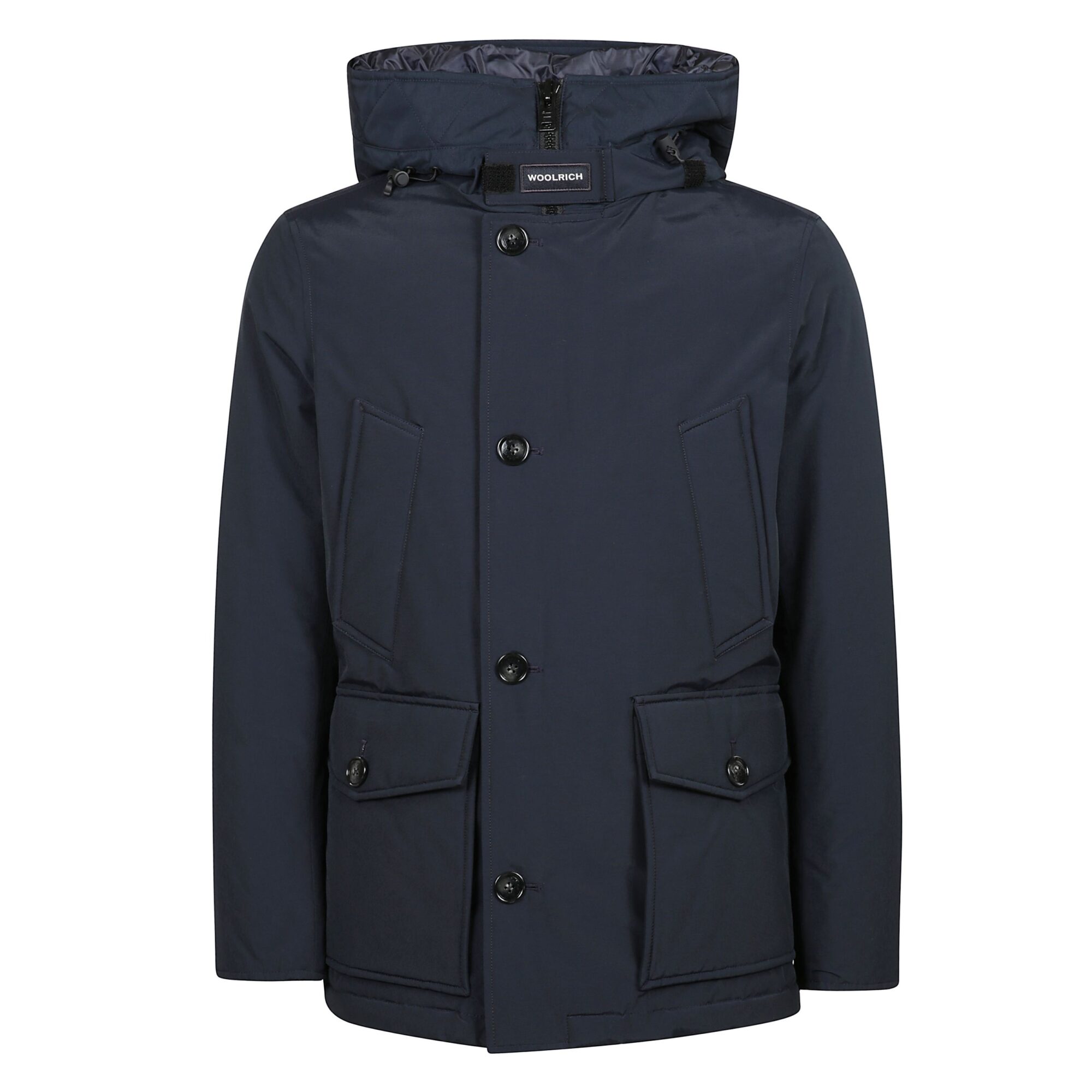 Arctic Anorak Woolrich. Design urban style in Ramar Cloth. Due tasche superiori verticali e due tasche inferiori con patta e bottone. Cappuccio regolabile con coulisse e chiusura con zip e bottoni frontale.