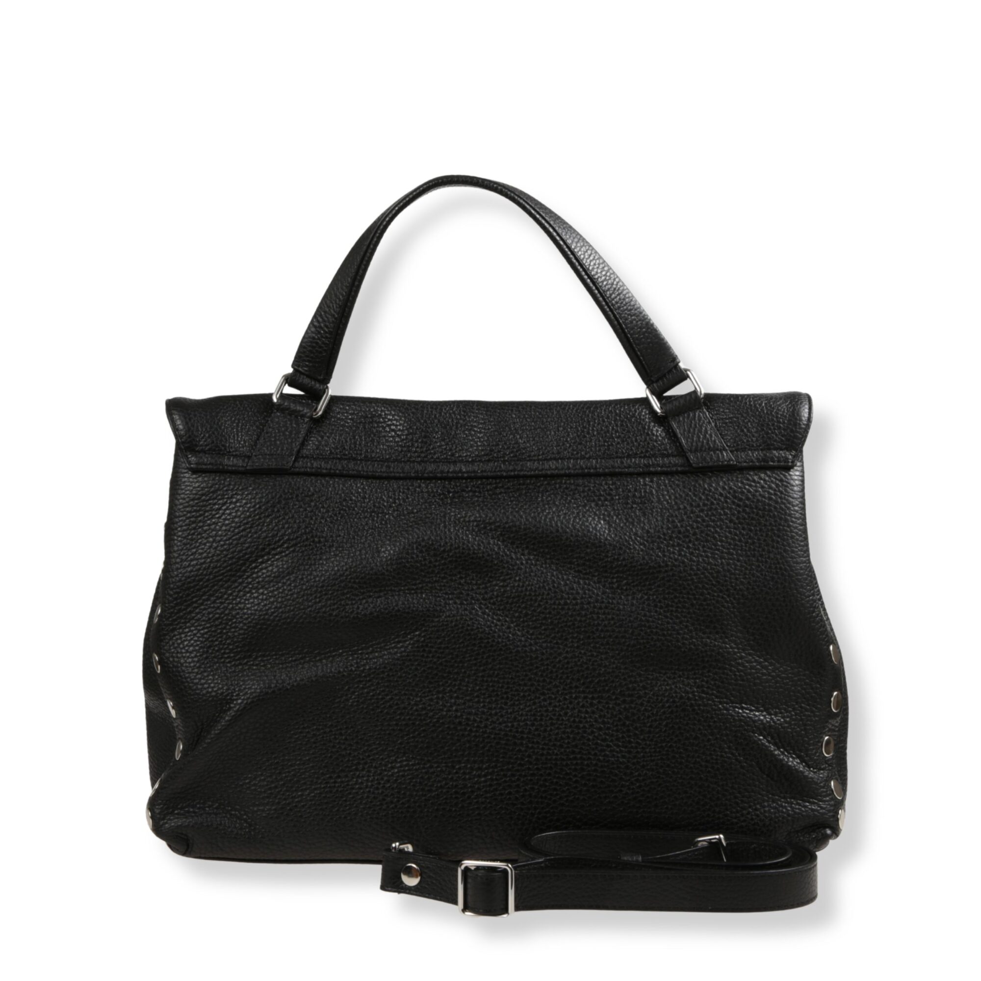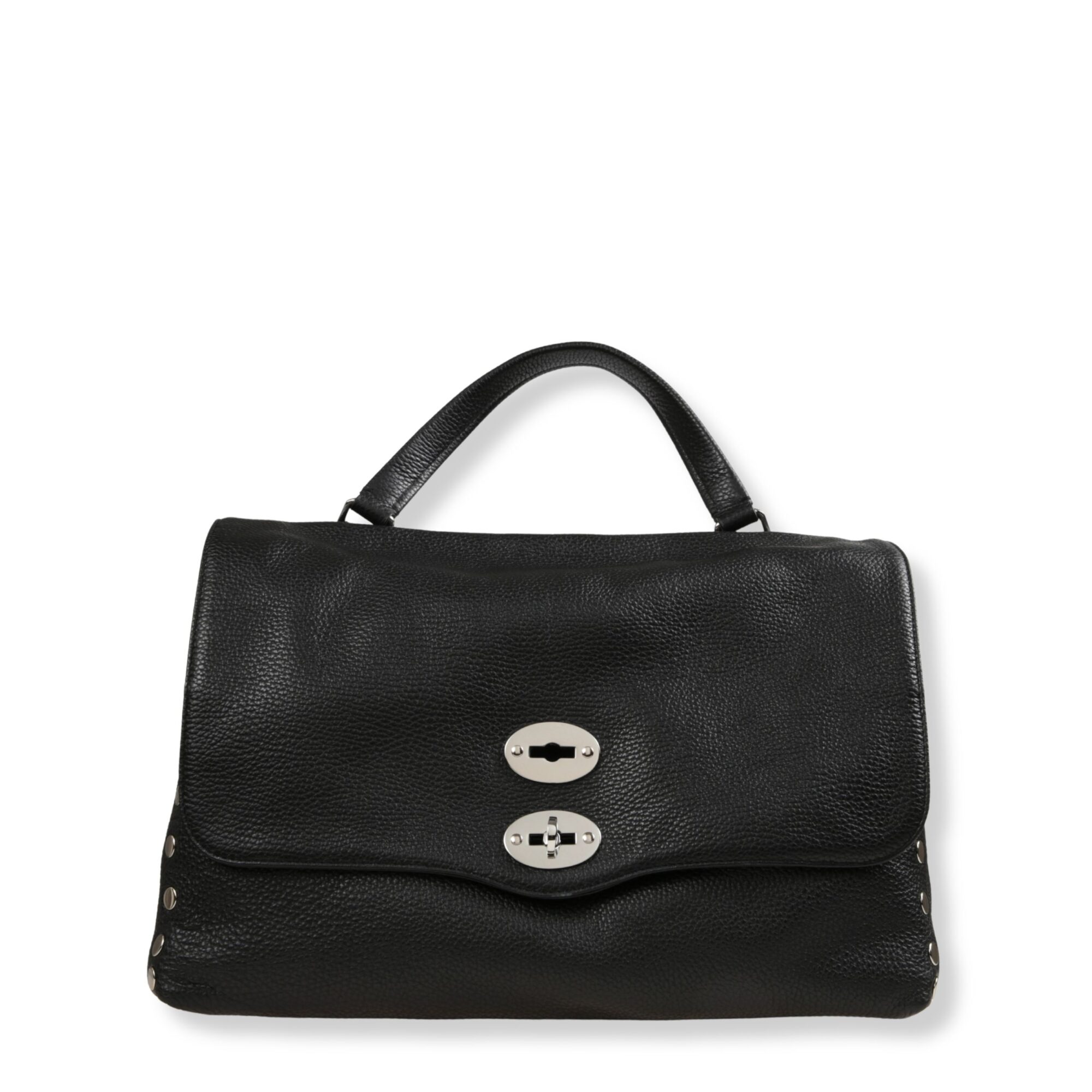Postina Medium Zanellato. Design iconico in pelle, decorata con rivetti sui bordi. Chiusura con patta frontale e fibbia twist-lock. Dotata di manico superiore e tracolla in pelle regolabile.