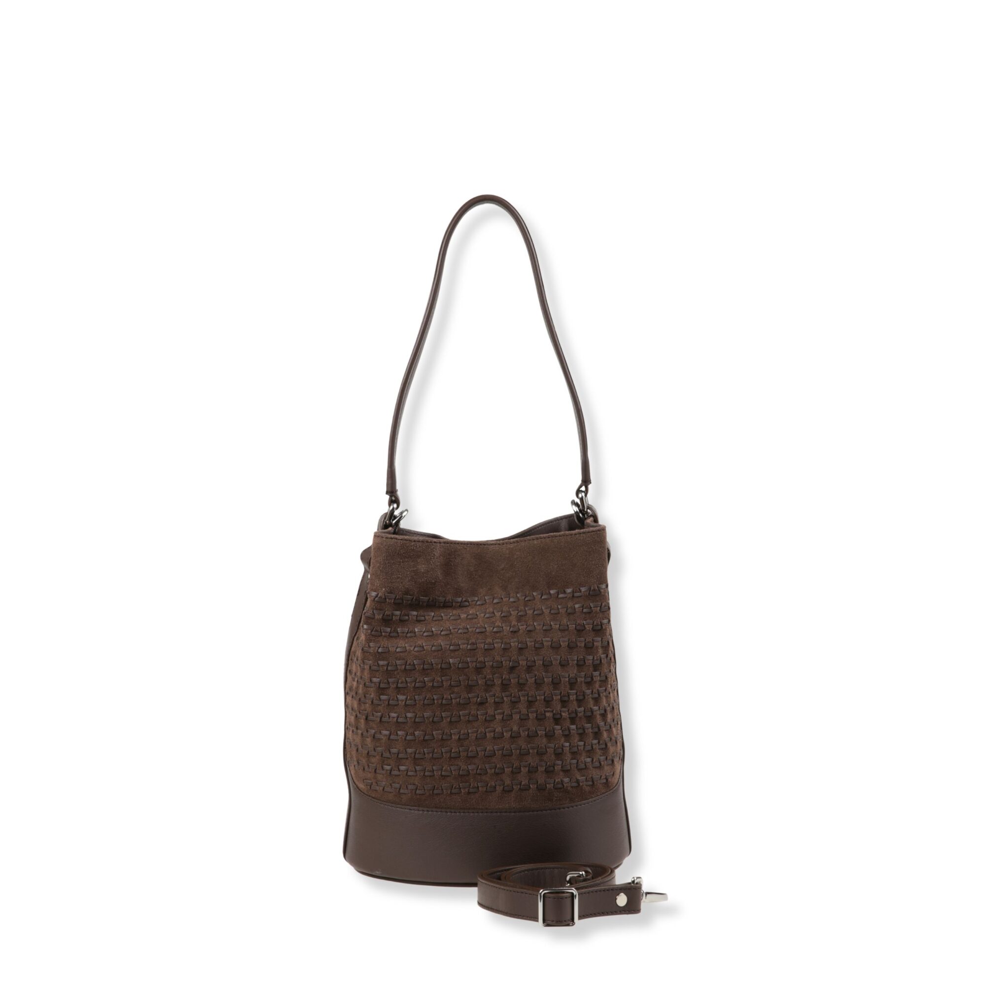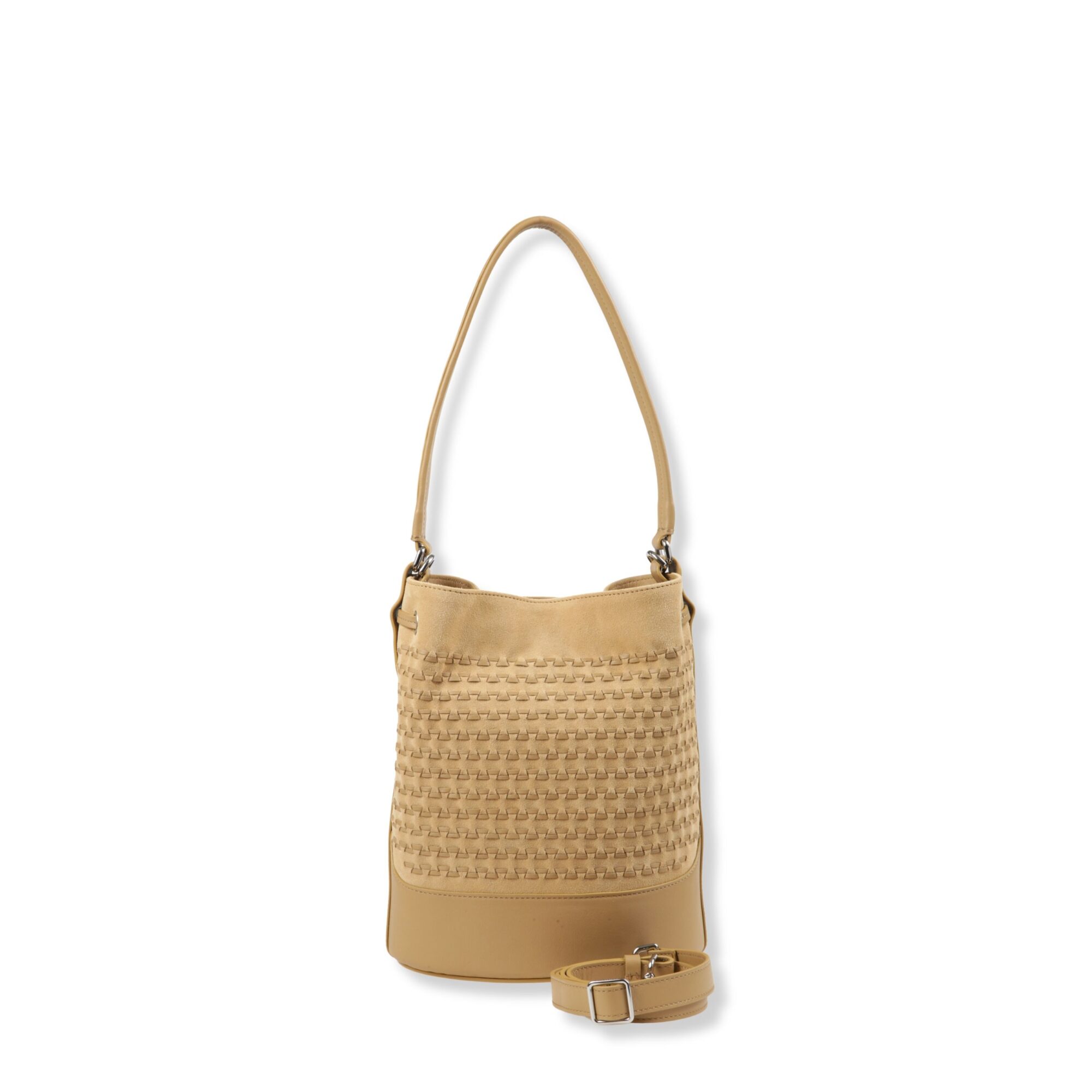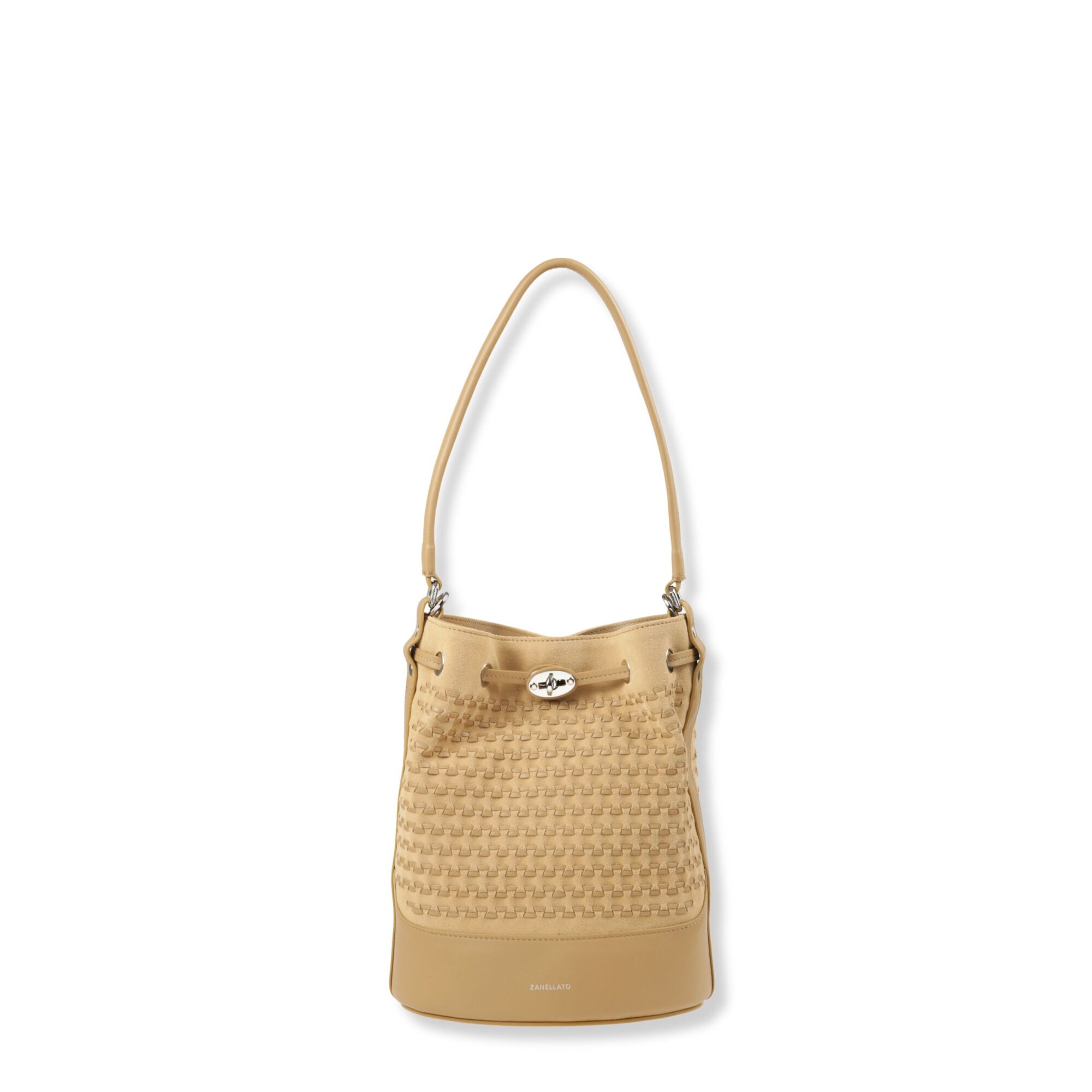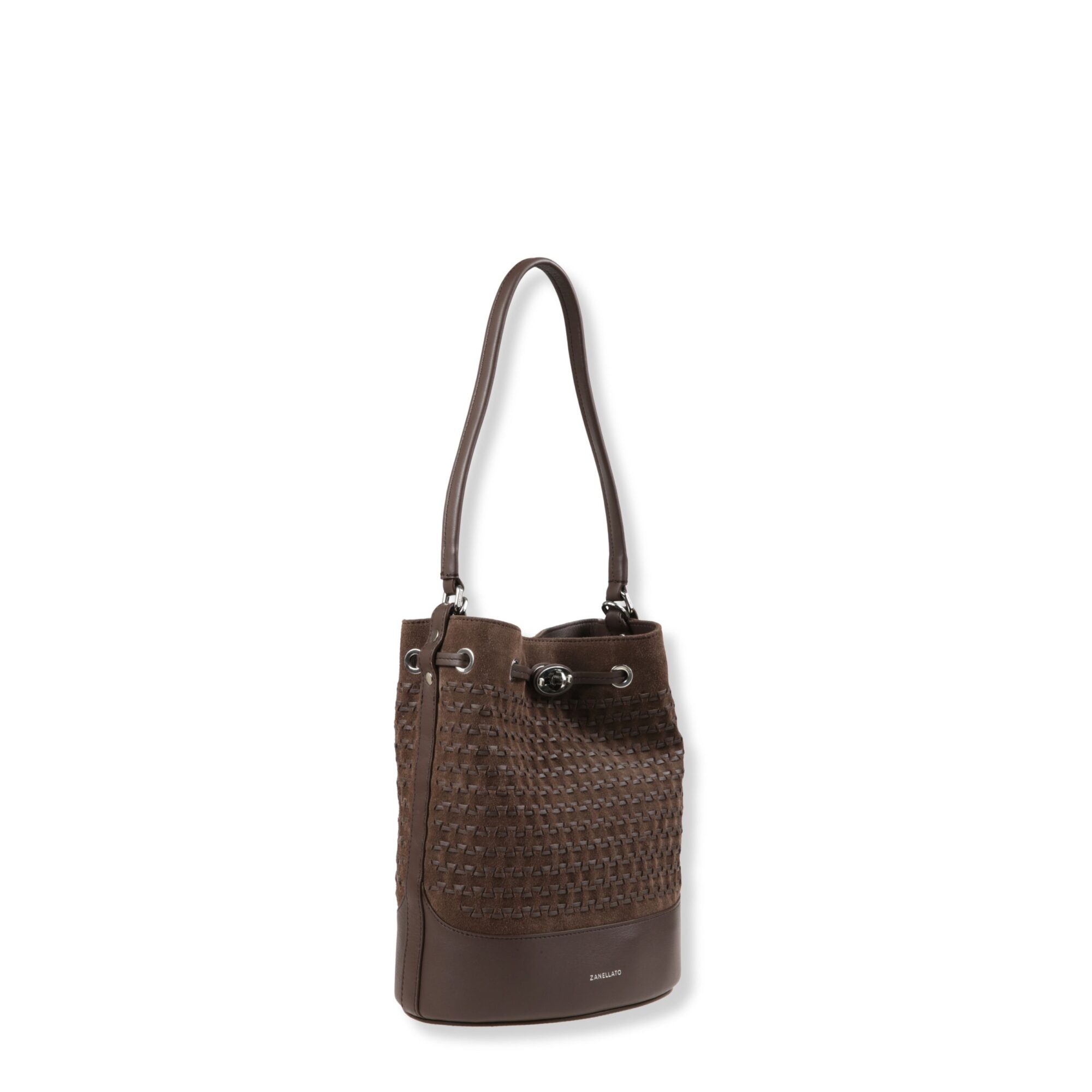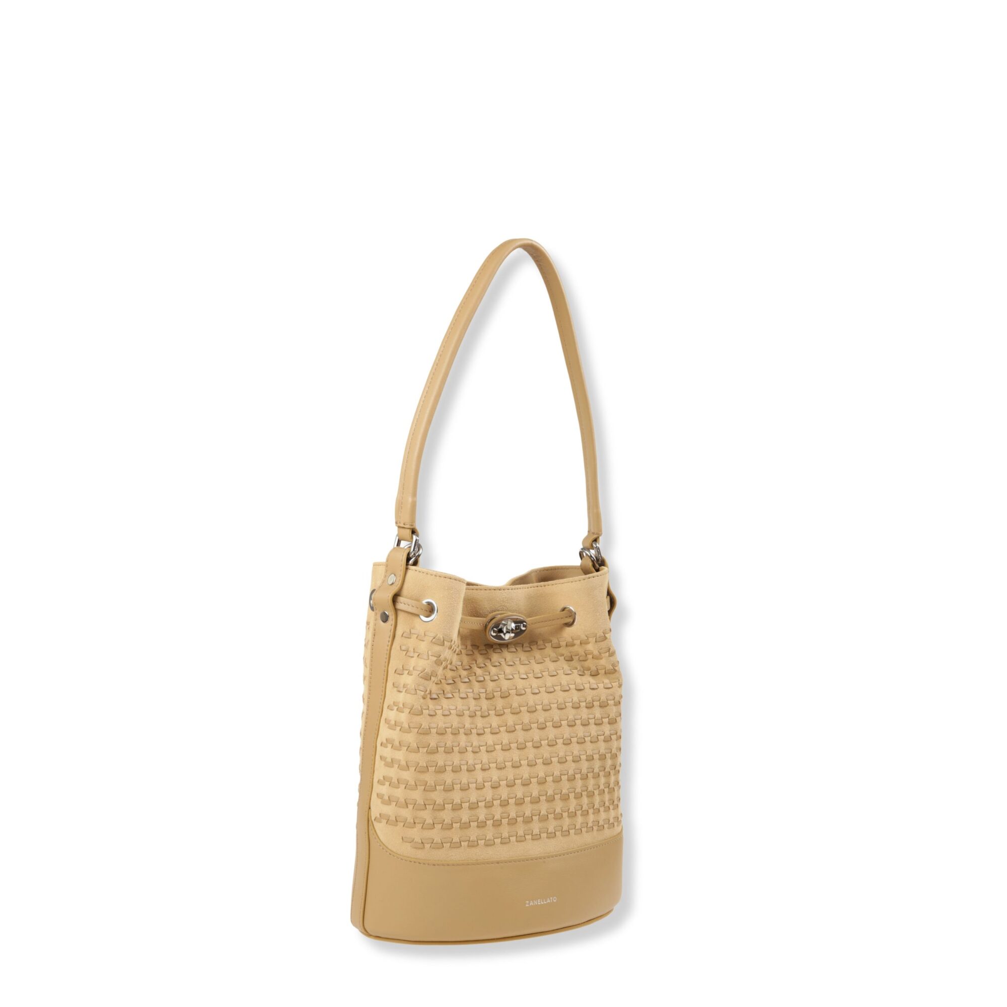 Mondà Small Zanellato. Design in pelle scamosciata con motivo su tutta la superficie. Chiusura con coulisse in pelle e fibbia twist-lock, manico superiore in pelle e tracolla regolabile e rimovibile.