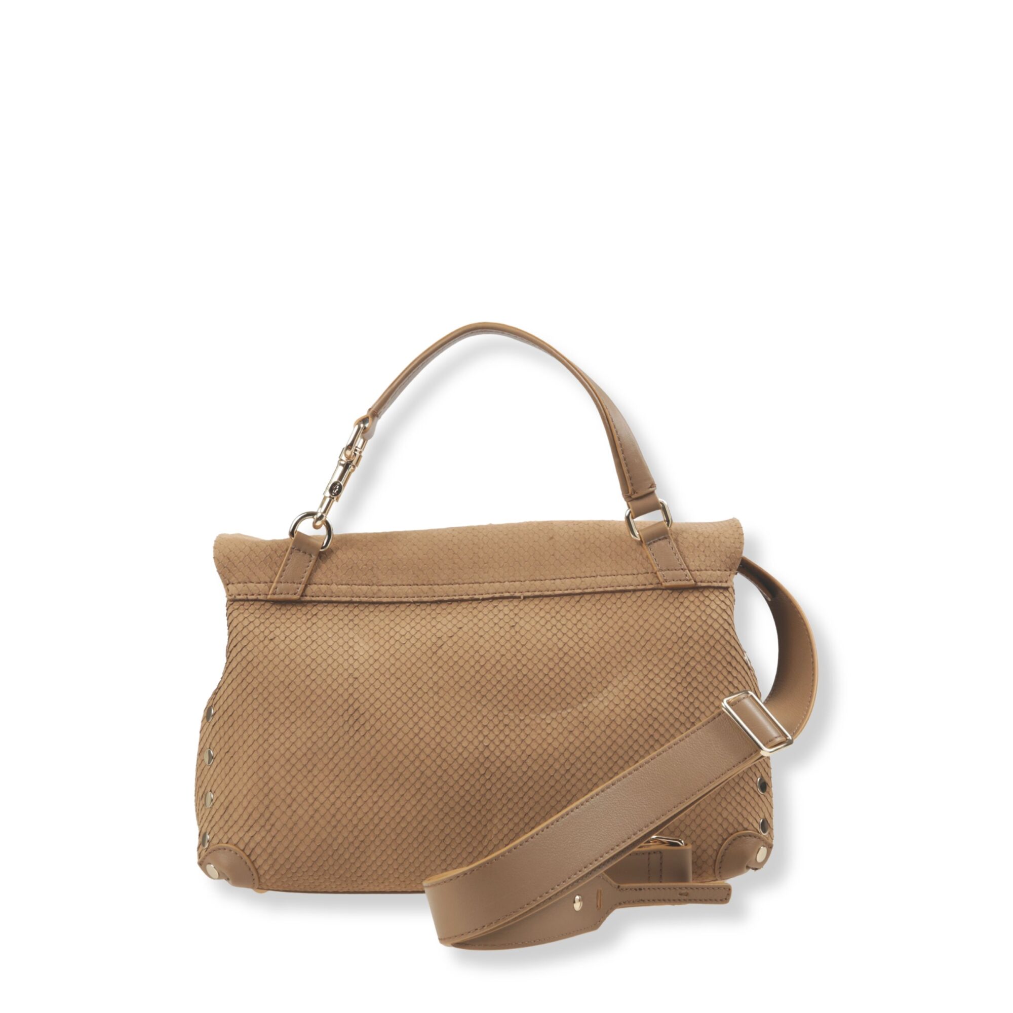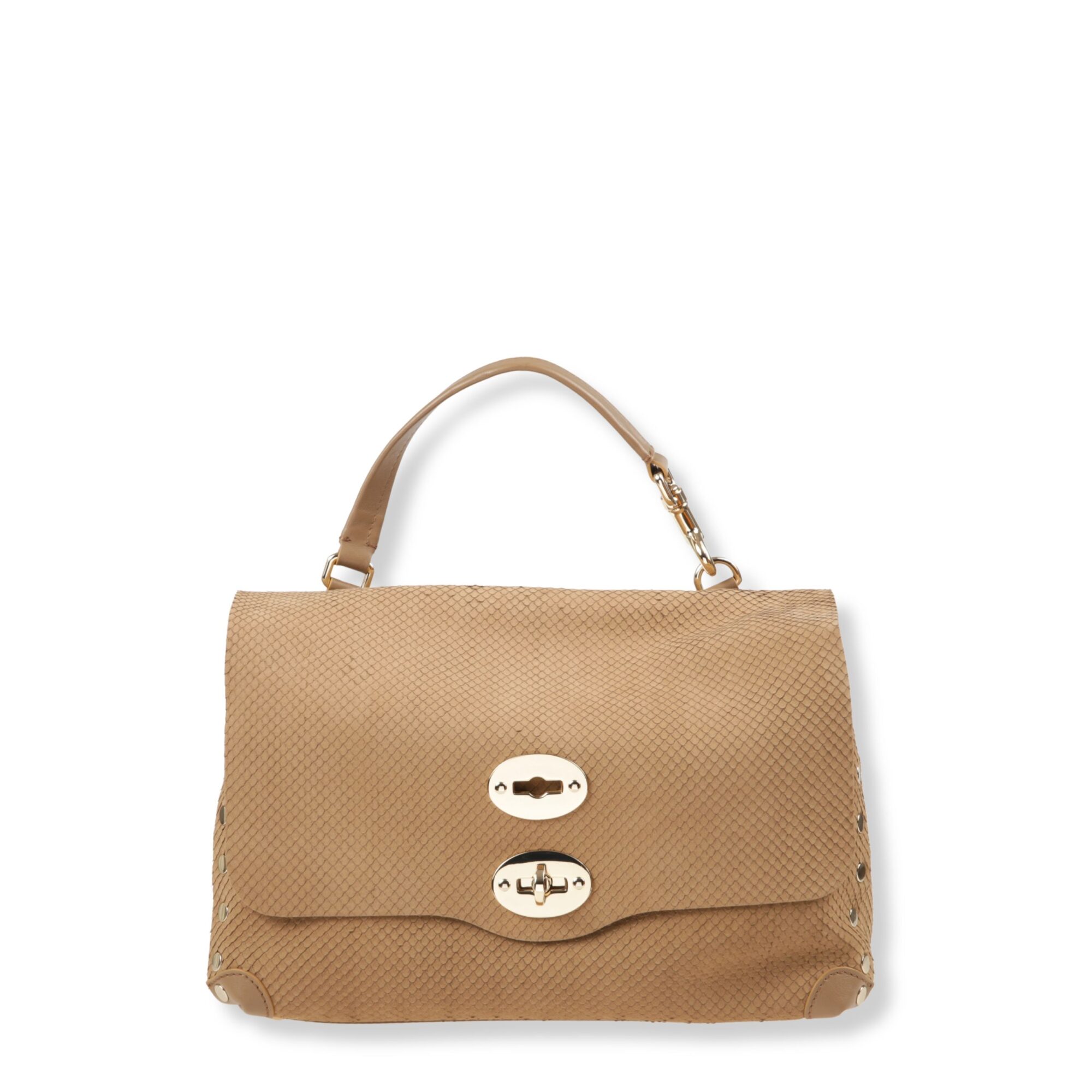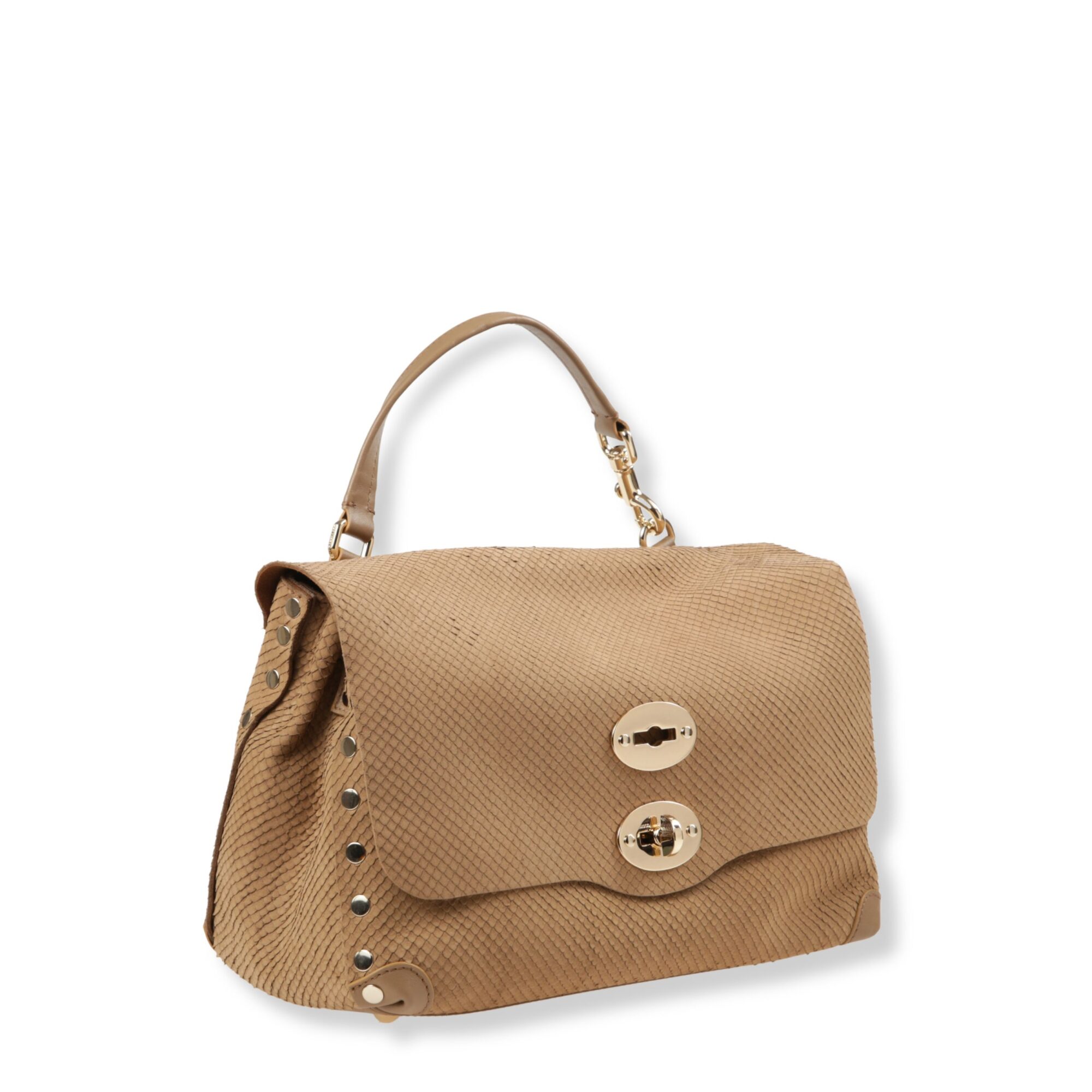 Postina Amoretto Small Zanellato. Chiusura con patta e fibbia twist-lock e borchie laterali. Manico singolo con tracolla rimovibile.