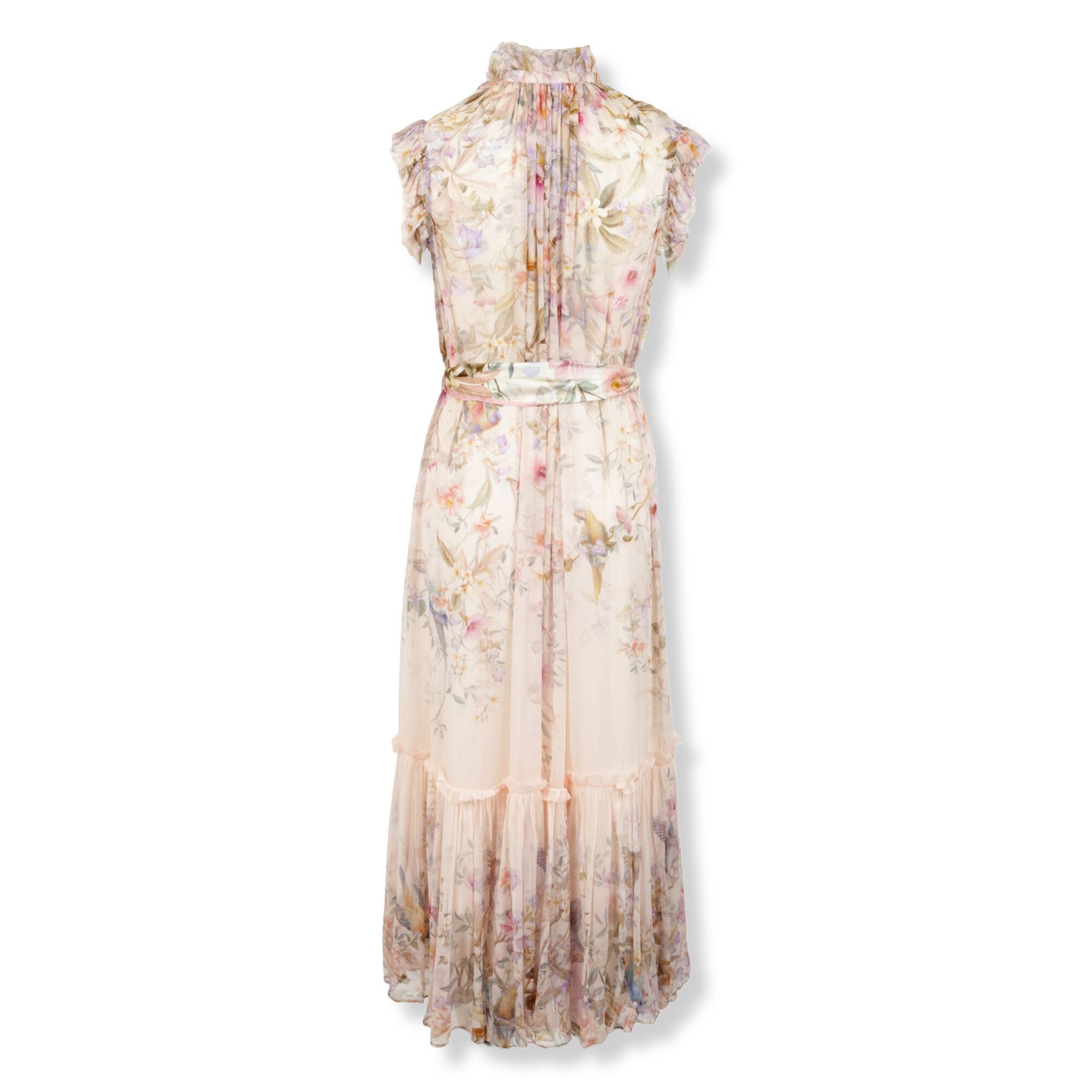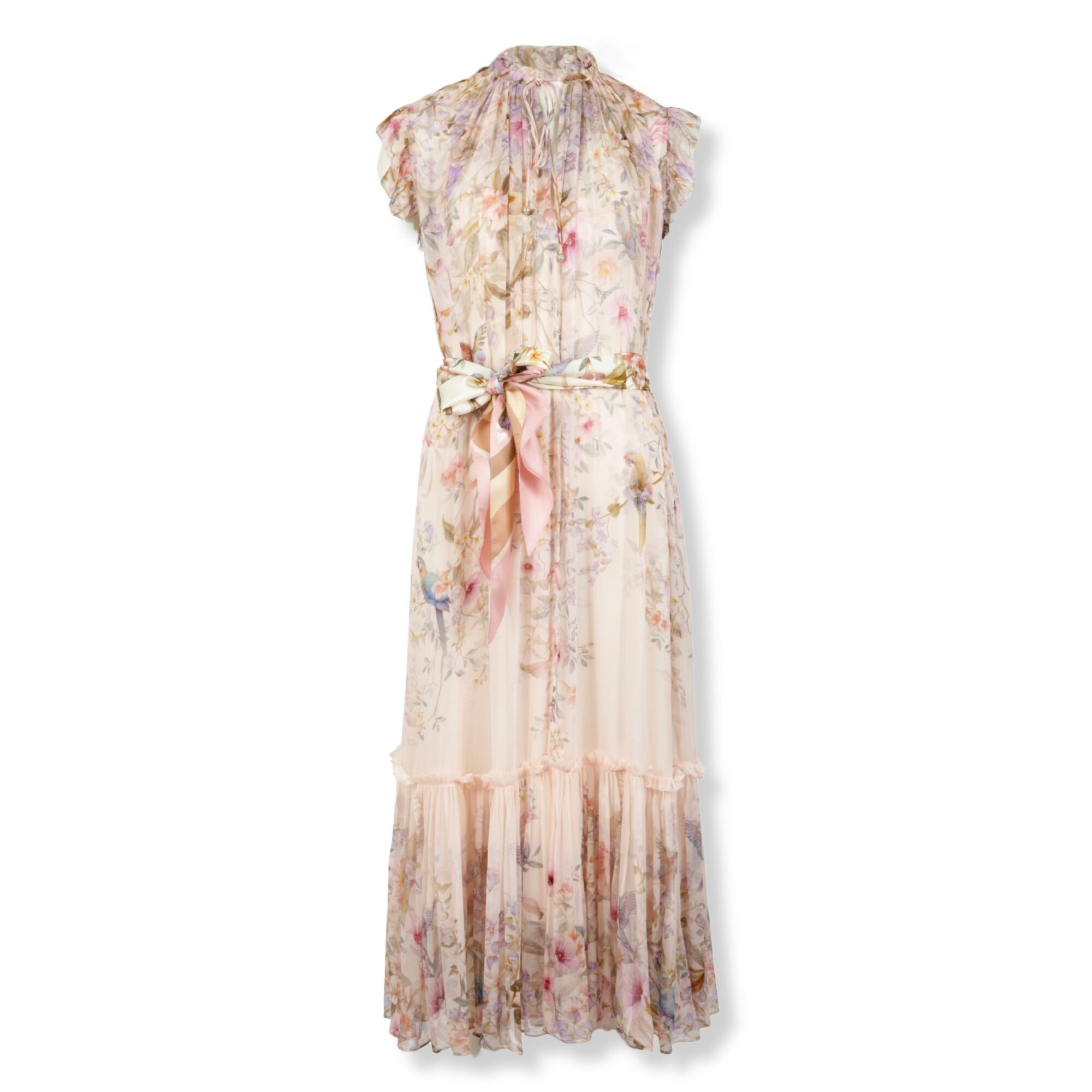 Abito Rebellion Zimmermann. Silhouette fluida e stampa a motivo floreale su tutto il corpo. Colletto arricciato con laccetti annodabili sul davanti e cintura coordinata in vita.