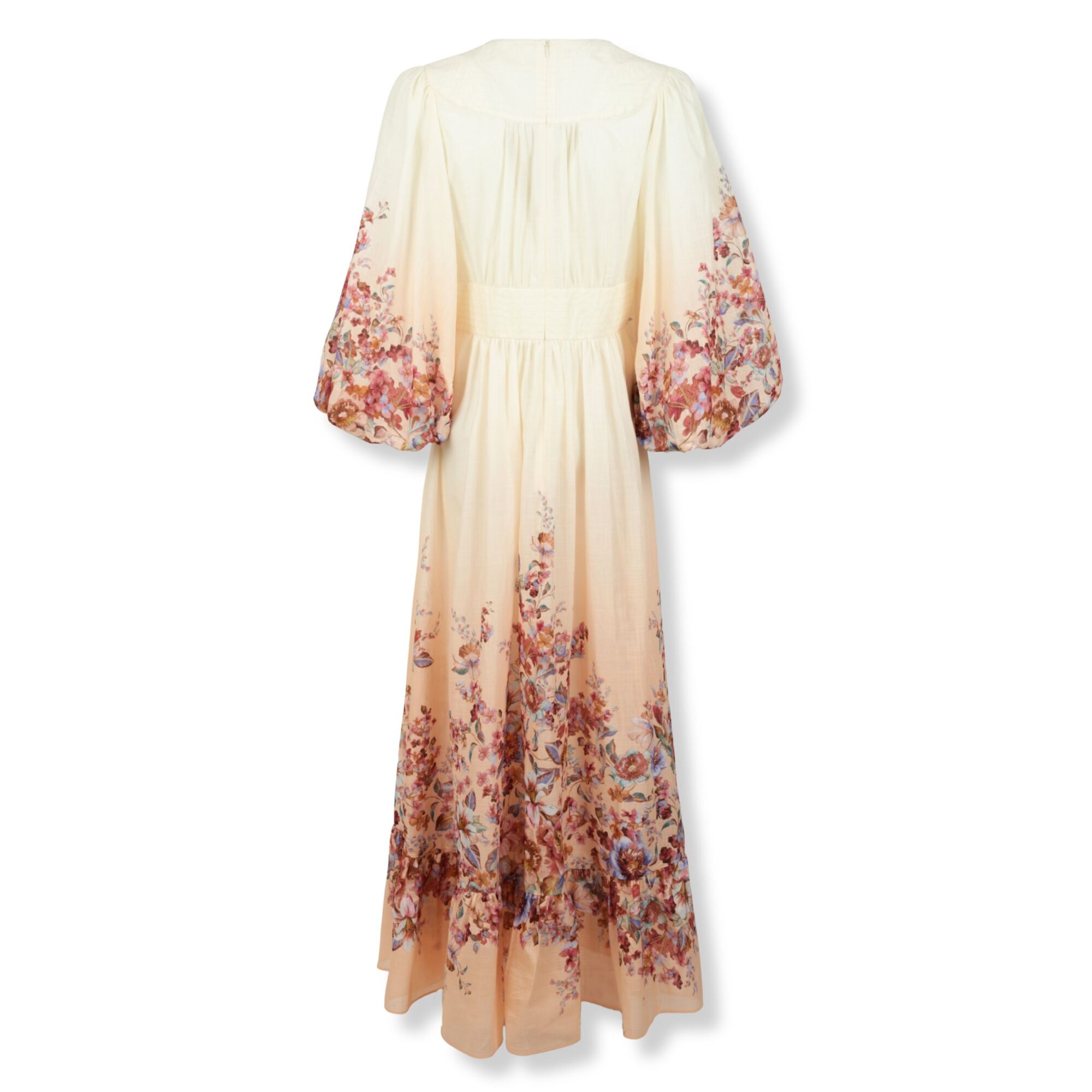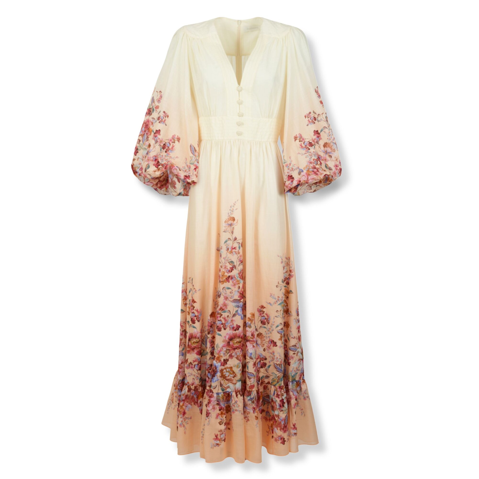 Awaken Plunge Maxi Dress Zimmermann. Scollo a V profondo e bottoni sul davanti, maniche lunghe a sbuffo. Fascia elasticizzata in vita e gonna con dettagli arricciati e linea svasata.