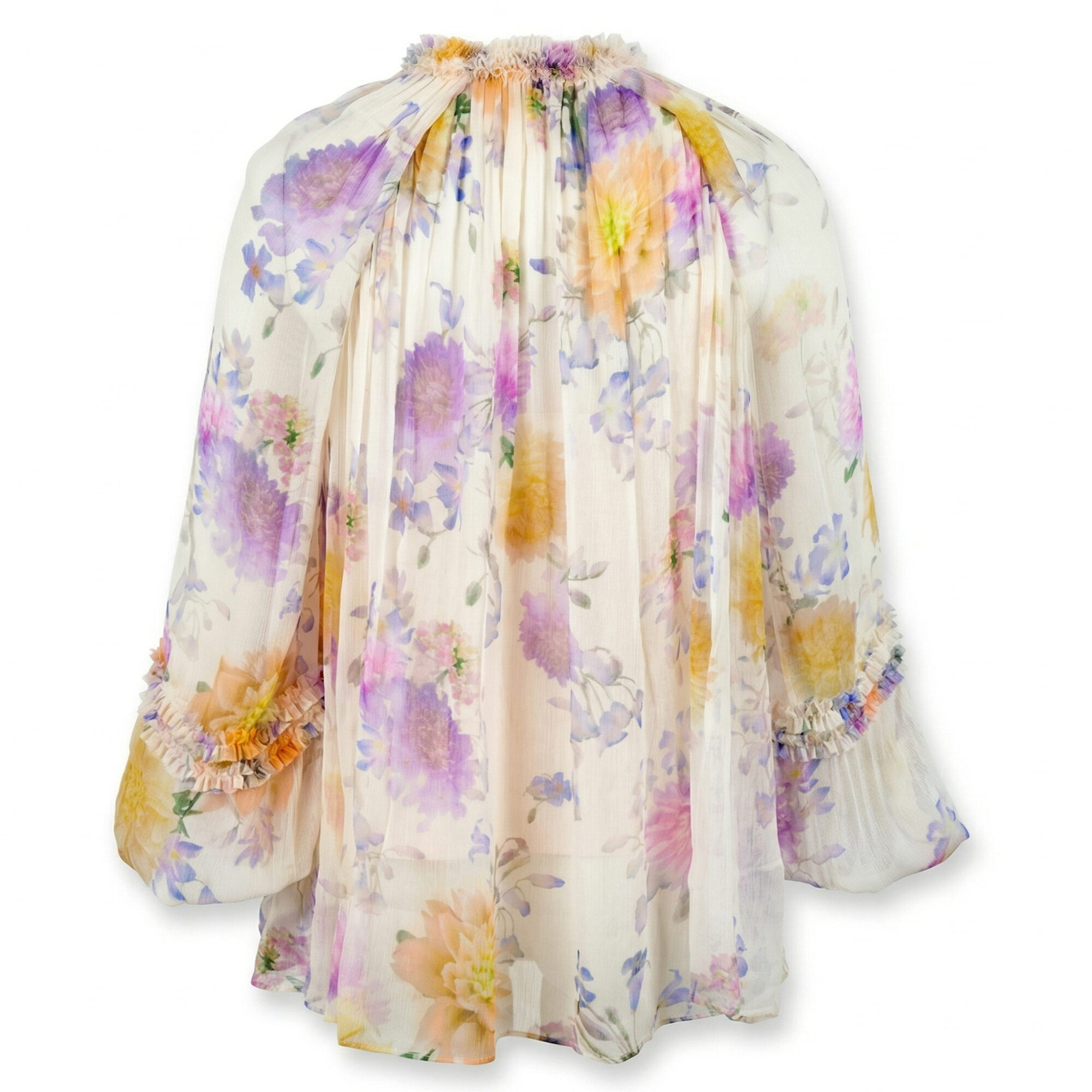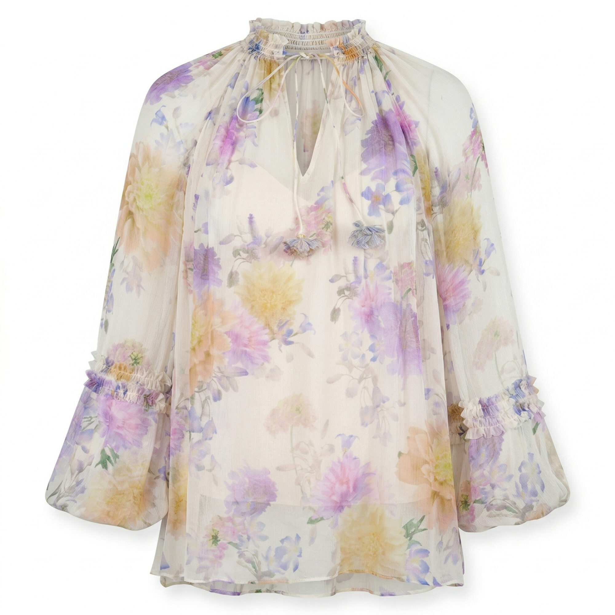 Blusa con Maniche a Sbuffo Luna Zimmermann. Profondo scollo a V, collo alto con laccetto annodabile a cordoncino, arricciature voluminose.