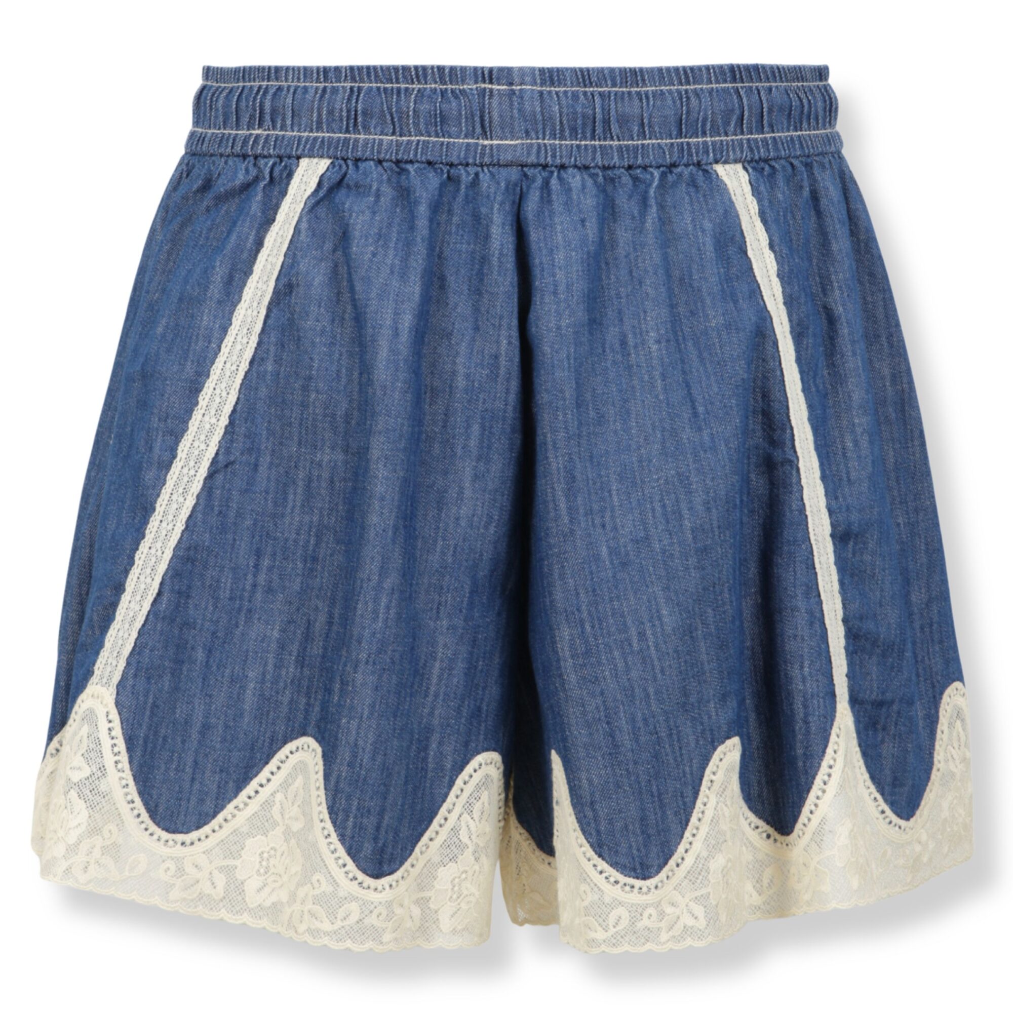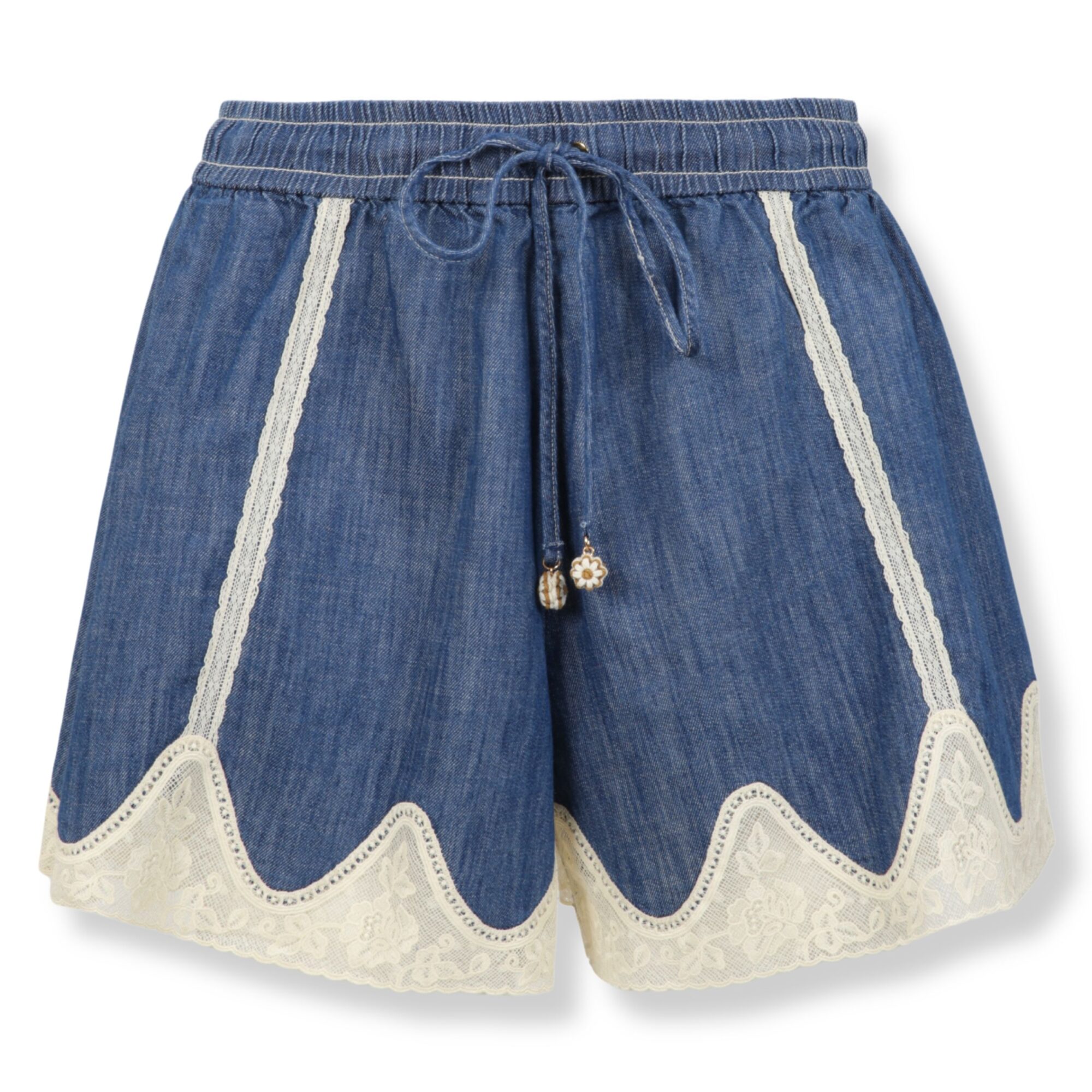 Awaken Denim Short Zimmermann. Desing in denim con inserti in pizzo, vita media elasticizzata con coulisse.